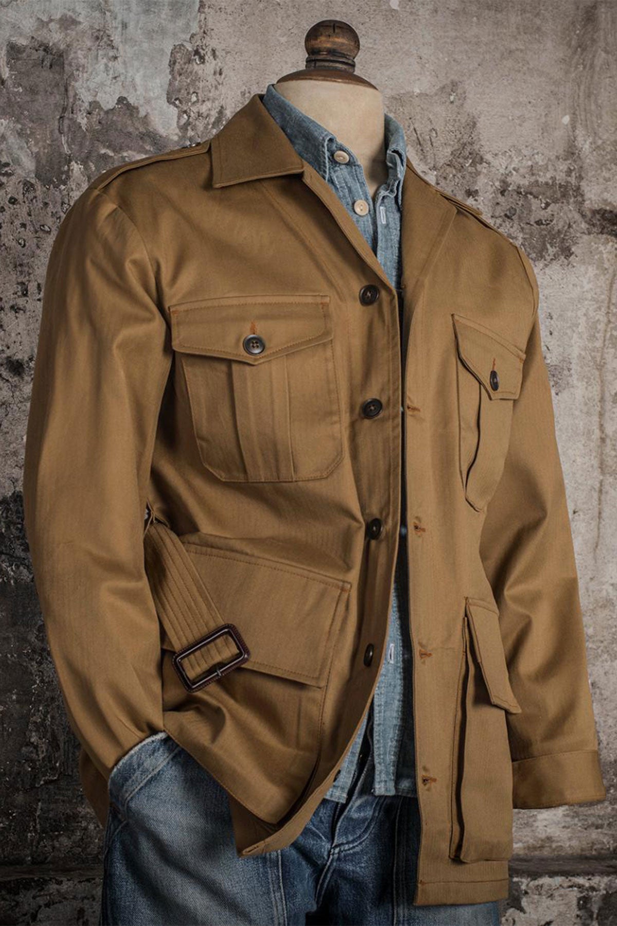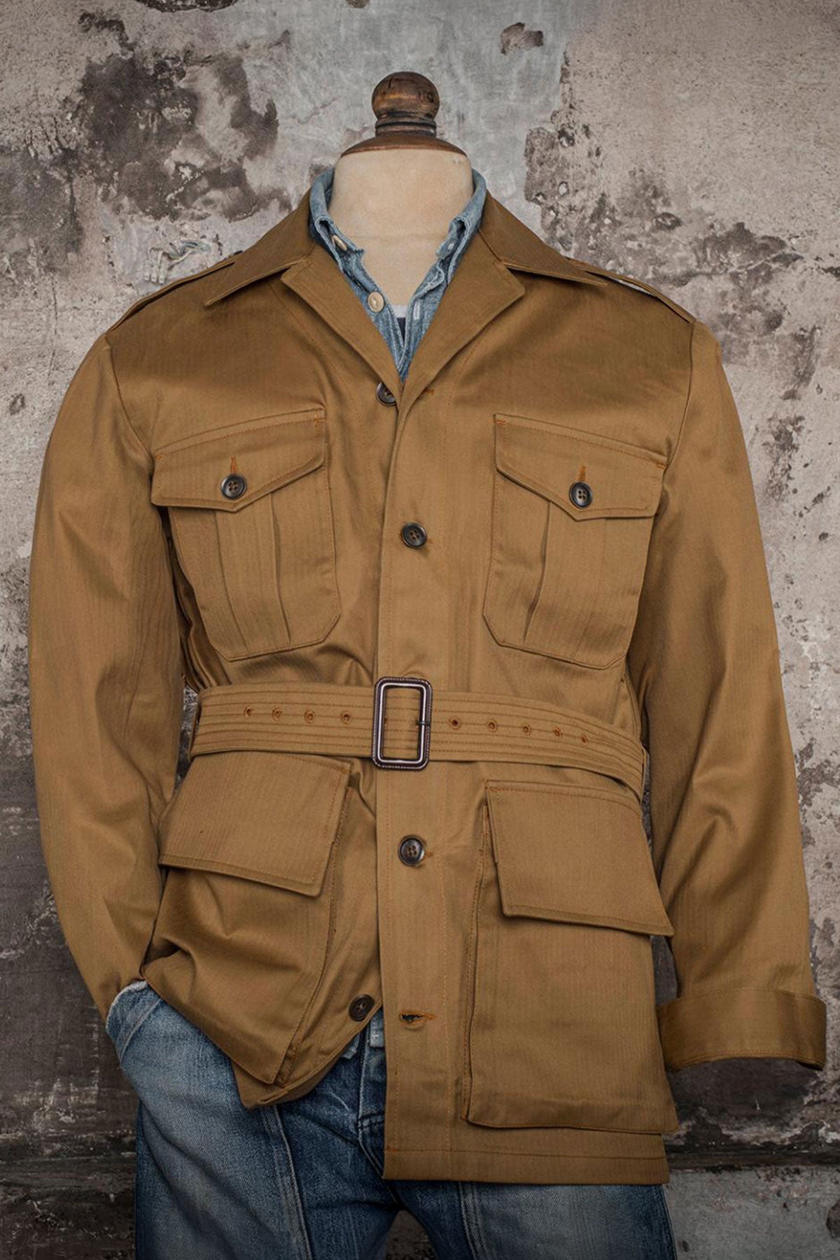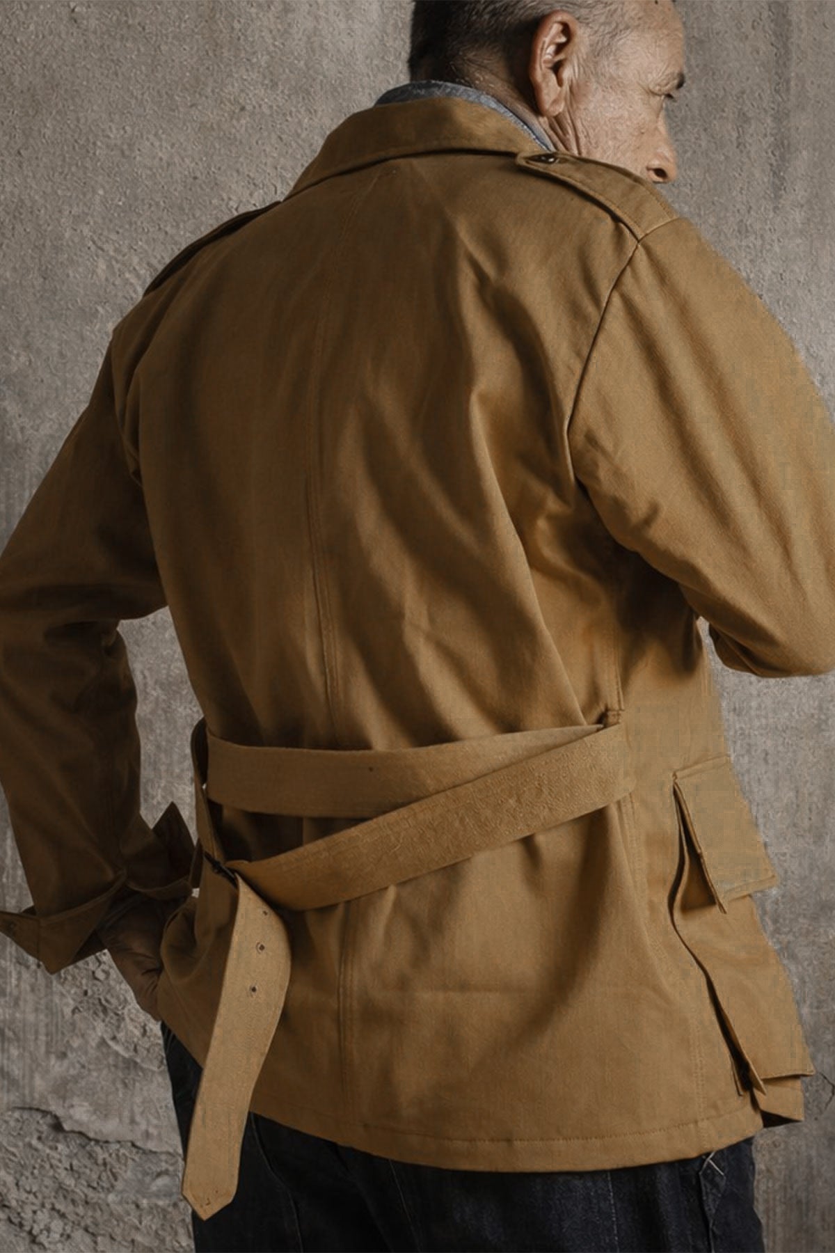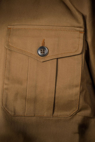 A heritage military classic reimagined with premium craftsmanship. Originally developed in the late 19th century for the British Army and later adopted during WWII, is crafted from 100% cotton HBT (Herringbone Twill) by British Millerain (England), this camel fabric is technical and water-repellent. Featuring four flap pockets, and an adjustable waist belt with buckle.