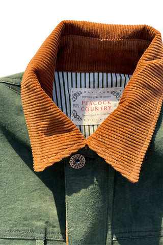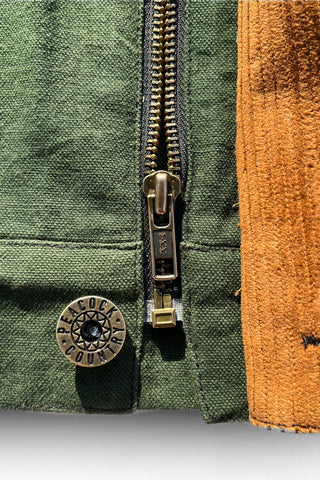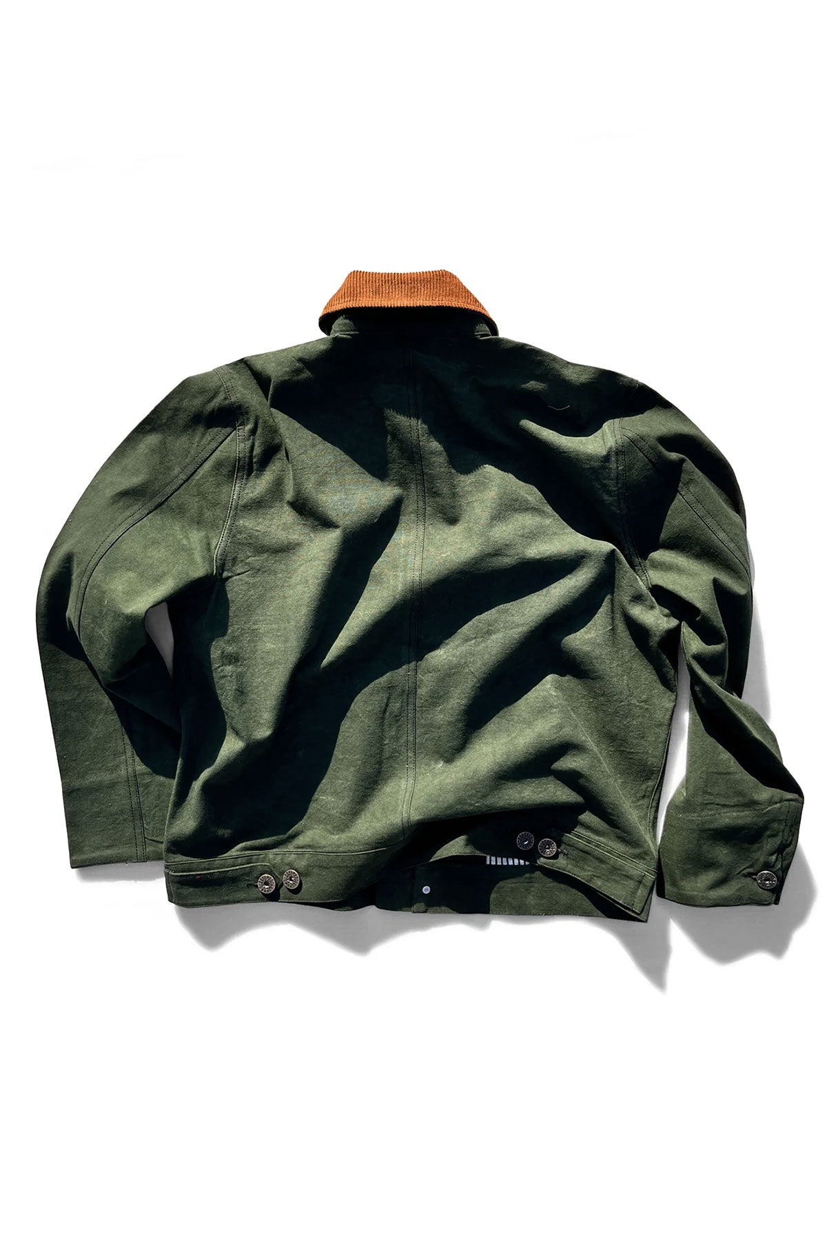 Practical details run throughout: adjustable waistband tabs to fine-tune the fit, a corduroy collar and inner hem for extra texture, and two front flap pockets for everyday use. Custom buttons and rivets reinforce the construction, while keyhole buttonholes and a concealed zip placket keep the front clean and simple.