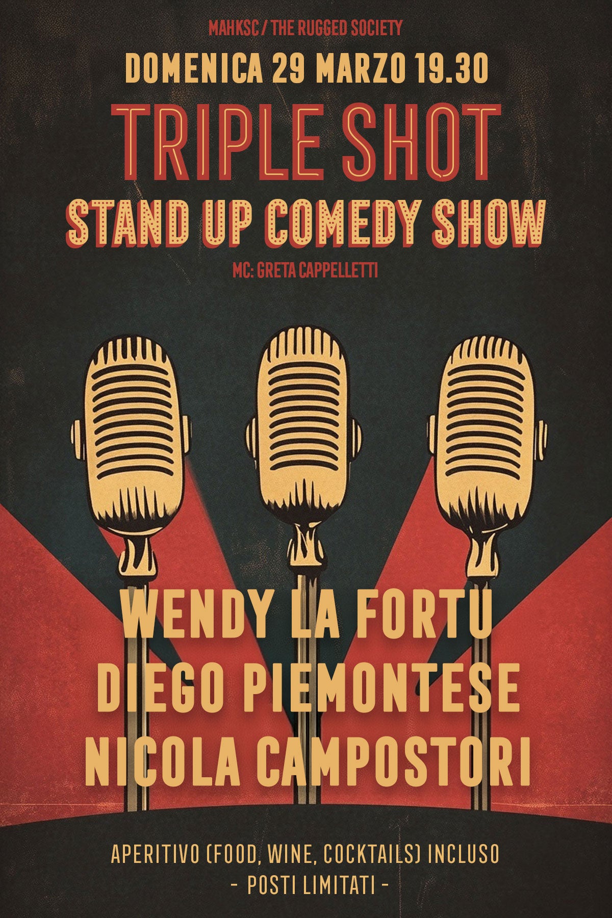 Aperitivo (food + open bar) incluso. Non uno, non due, ma ben tre comici per questa serata! WENDY LA FORTU, DIEGO PIEMONTESE, NICOLA CAMPOSTORI Presenta: Greta Cappelletti.