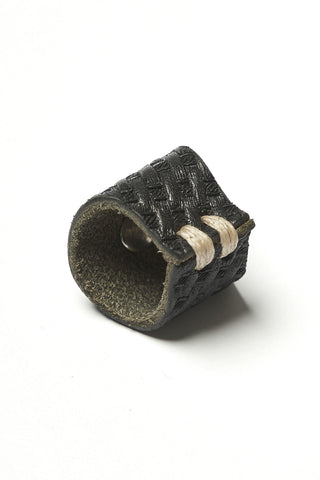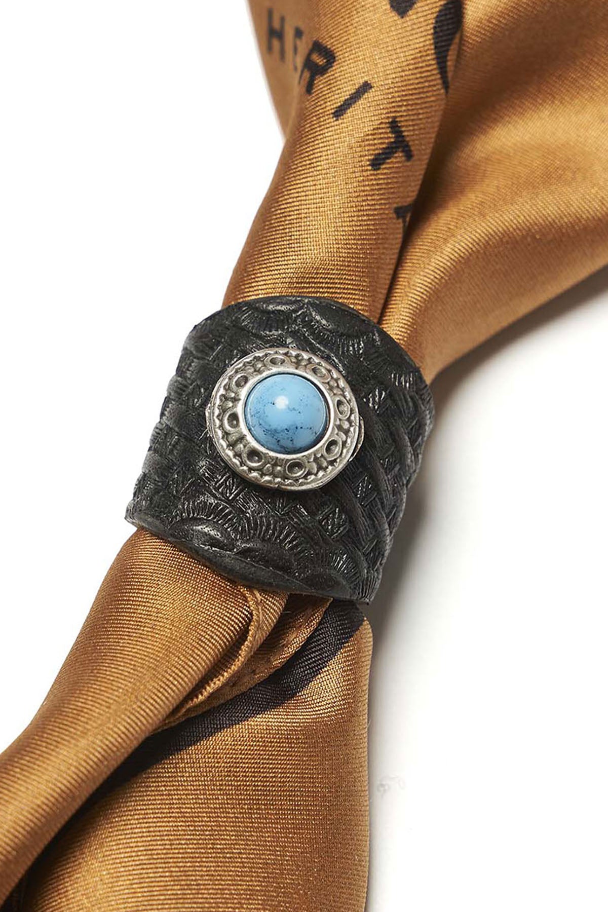 The Shangri-La Heritage bandana slider is crafted from 100% vegetable tanned cowhide. The leather is embossed with a woven pattern that gives it texture and character, while the interior provides grip.cAt the center, a turquoise stone sits in an antique-finish metal concho, adding a classic Western touch without feeling overdone. Handmade in Italy
