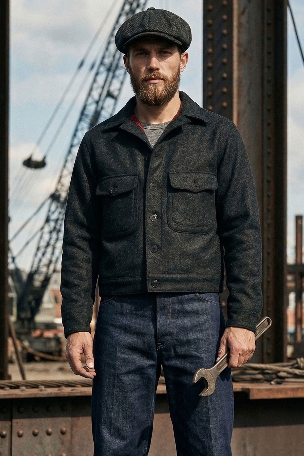Freenote’s cropped take on a classic, cut from a 10 oz wool blend sourced from Japan and built with purpose. The silhouette is short and clean, rooted in vintage American workwear but refined for modern wear.