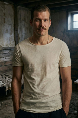Designed with a classic 1920s silhouette, this short sleeve crew neck T-shirt features a puristic hand-sewn collar and a traditional triangle insert under the arms for better mobility. The slightly extended length accounts for natural shrinkage after washing, ensuring a consistent fit over time.