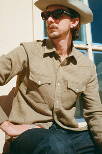 A rugged classic with refined texture, this houndstooth flannel shirt blends timeless patterning with Western-inspired details. Woven in earthy tones of olive and rust, the micro-houndstooth pattern adds depth and character without overwhelming, giving the fabric a warm, vintage feel. The flannel has a soft, slightly textured hand, comfortable enough for everyday wear yet durable for cooler seasons.