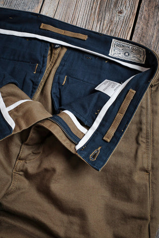 The Shifter Pant | Inspired by classic garage style pants, the fit is generous without being too baggy. Freenote's goal was to design a comfortable pant with a timeless aesthetic. Starting with their Workers Chino as a template, They opened up the top block by adding room to the thigh and giving the pant a higher rise for a more relaxed seat. The leg opening was also widened to create a balanced straight-fit. They employed the same interior finishing details found on the Workers Chino, including a two-piece waistband finished with binding and herringbone pocket bags from Japan.