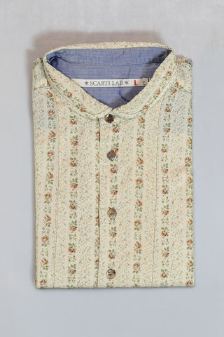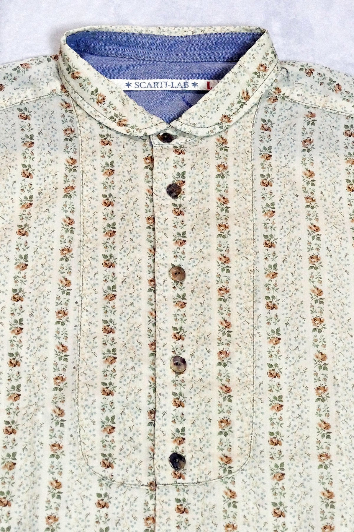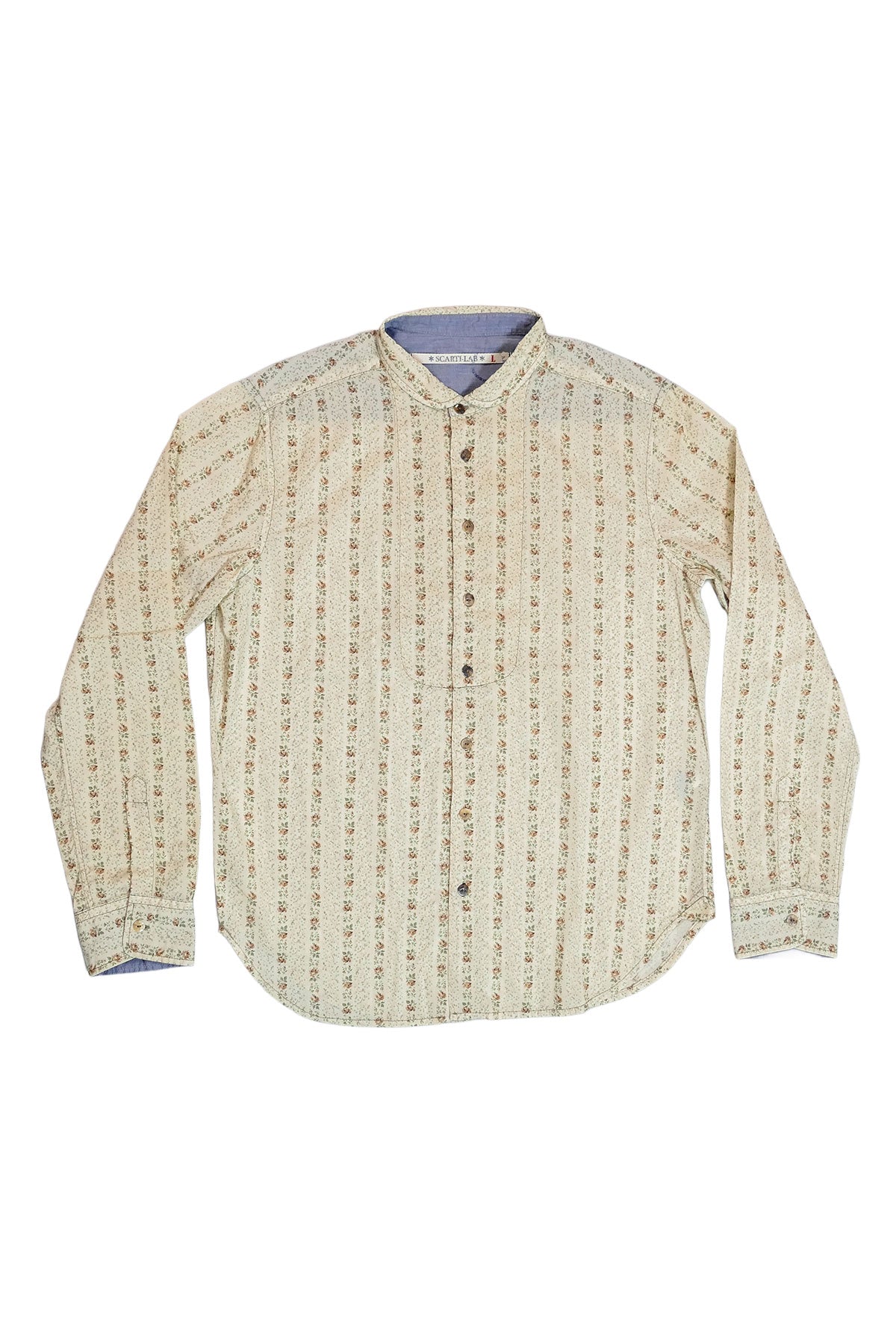 The Scarti Lab 337 SL532 Round Collar Shirt in Ecru is a sophisticated blend of timeless design and exquisite fabric. This shirt features a distinctive round collar, a bib, and a rounded hem, offering a refined silhouette that makes it perfect for both casual and semi-formal occasions.