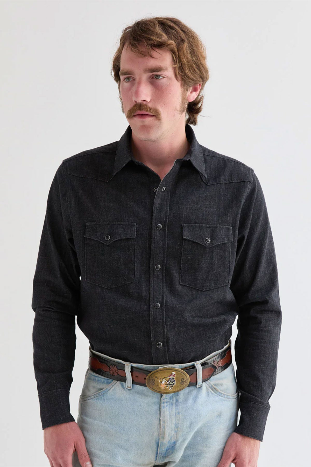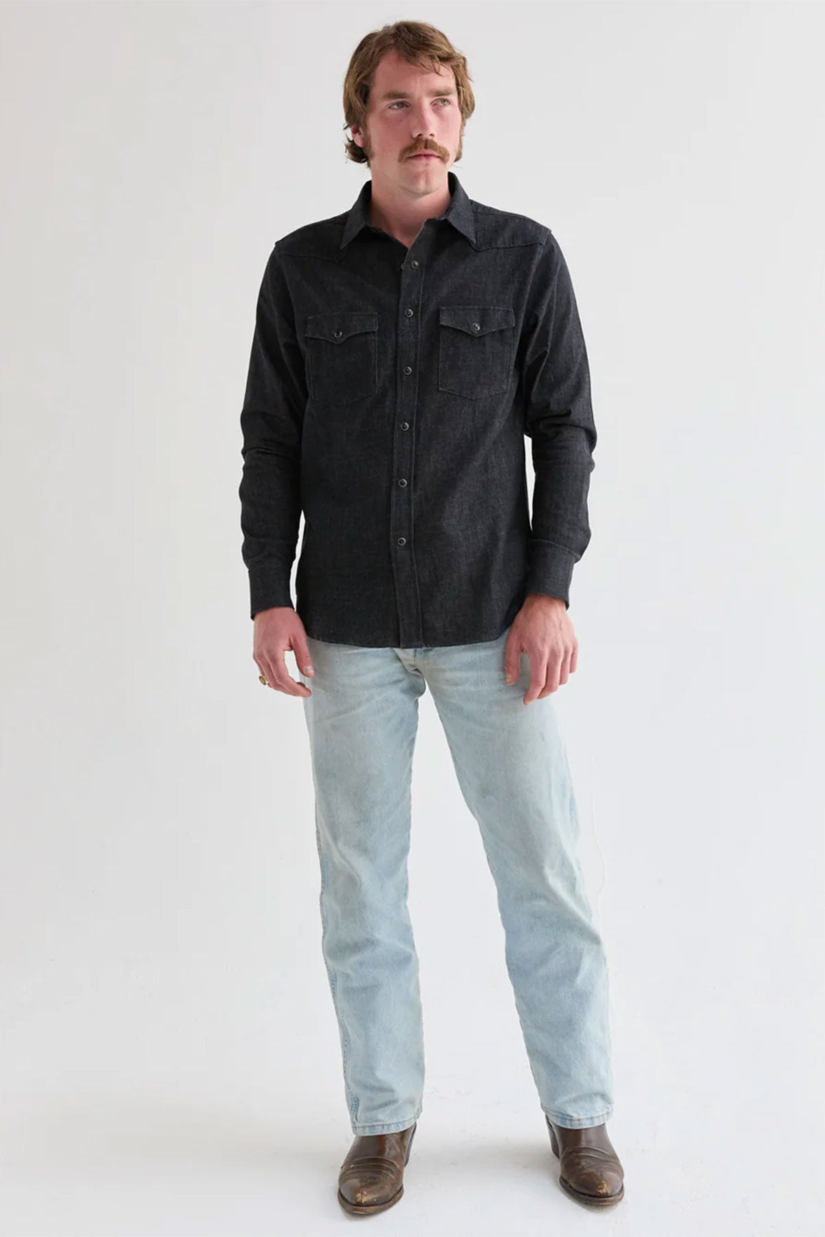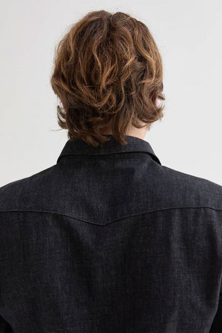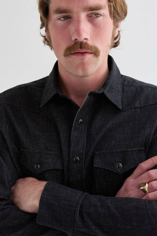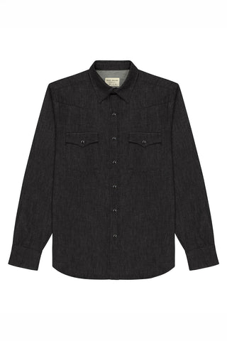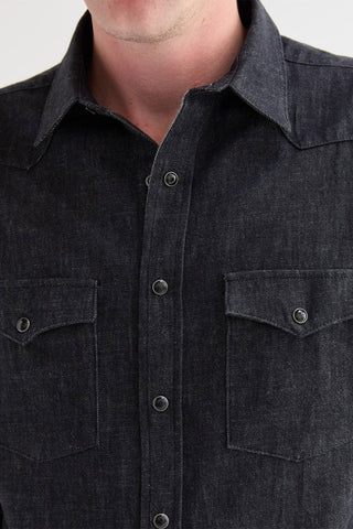 The West Major Black Denim Shirt delivers a clean, modern take on a Western classic. Made from 100% cotton black denim at 7 oz, it offers a structured feel with all-day comfort thanks to a pre-washed finish. Designed in a tailored fit, it features double chest pockets, front and back western yokes, black marble snaps, and corozo buttons at the collar and cuffs. Made in the USA.