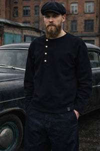 This Henley sweatshirt takes cues from 1920s and ’30s underwear, with a distinctive shell-button placket shifted slightly to the left. The detail is subtle but gives the garment a unique character.