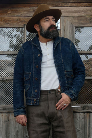 The shawl-style collar lends the jacket a tailored edge, bridging the gap between rugged heritage and contemporary poise. Its curved patch pockets and antique-style corozo buttons evoke a sense of purpose, of garments made to endure rather than adorn. Contrast stitching highlights every line of construction — visible proof of the maker’s hand and intention.