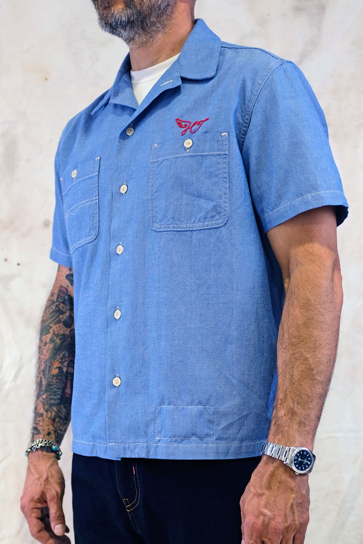 The chambray is light enough for heat, strong enough to hold its shape through the day. It breathes, it moves, it keeps a clean line. This is the kind of work shirt that earns its place over time, not in the fitting room.
