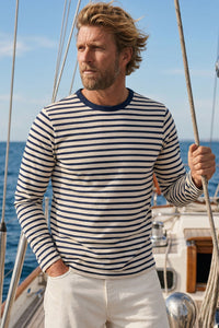 The sun is warm on the shoulders. The sea is close—you can smell it. This long sleeve is a nod to the sea without the need to dress like a sailor. Navy stripes add good vibes to any look. That's it.