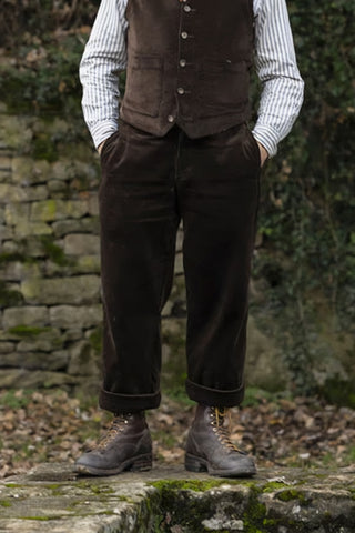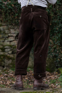 Made from thick, dark brown corduroy with bold, pronounced ribs, these trousers offer exceptional warmth and texture — perfect for autumn and winter days.