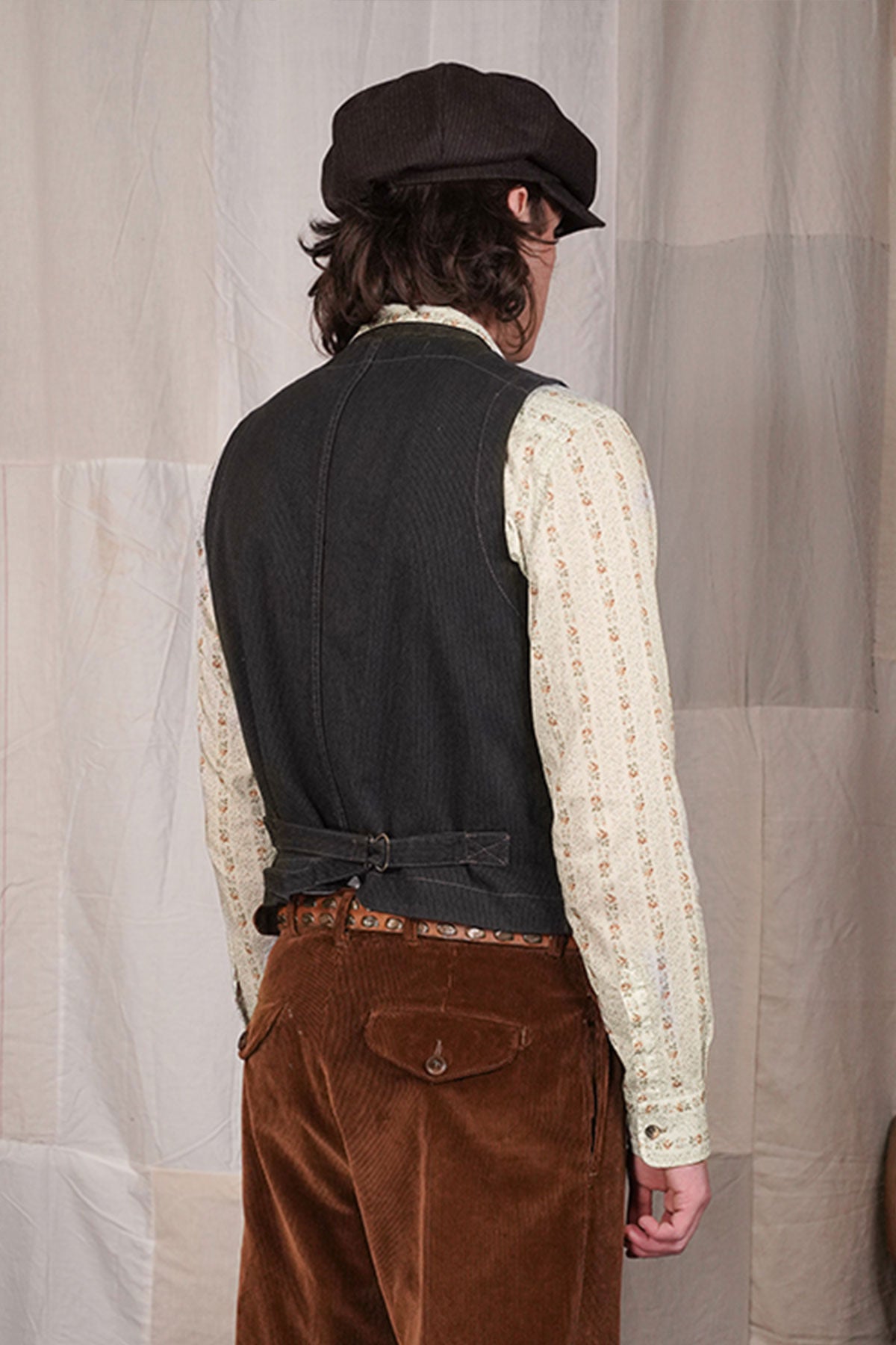 The 403 SM416 Work Vest blends Japanese textile craftsmanship with Italian tailoring tradition. Made from a 100% striped cotton twill woven in Japan, this piece combines durability with an understated sophistication, ideal for layering through the seasons.