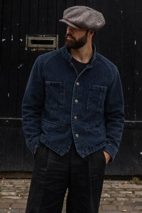 A short jacket with a stand-up collar and raglan sleeves and a waistcoat-style hem, reworked with the look of a 1960s British engineer’s jacket. The front features laurel donut buttons, and the fit can be adjusted with side adjuster belts on the back. It’s made in Japan from indigo-dyed cotton sashiko fabric.