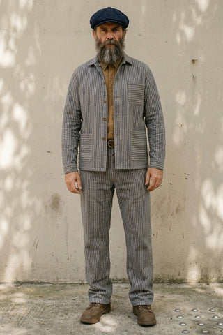 A vintage-inspired work jacket made from breathable cotton-linen fabric with natural texture and structure. The blue vertical stripes on a warm brown base create a subtle, heritage look reminiscent of classic workwear. Designed with a straight cut, chest pocket, and two patch pockets for everyday practicality. Finished with durable natural corozo buttons and crafted in Italy for refined construction.