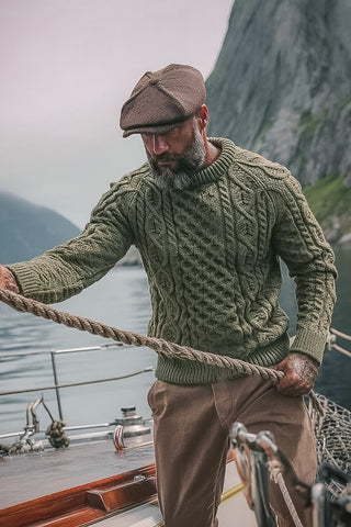 Originally created for fishermen going out in wet windy conditions at sea, a true fisherman's rib needs almost double the yarn of a plain knit jumper of the same size, making it extra warm when the weather closes in. This Hudson Aran is a 5gge chemical free British wool jumper, with natural water repellency and antibacterial properties. Sourced from a British Wool Accredited farm in Yorkshire - just 60 miles from the Peregrine factory.